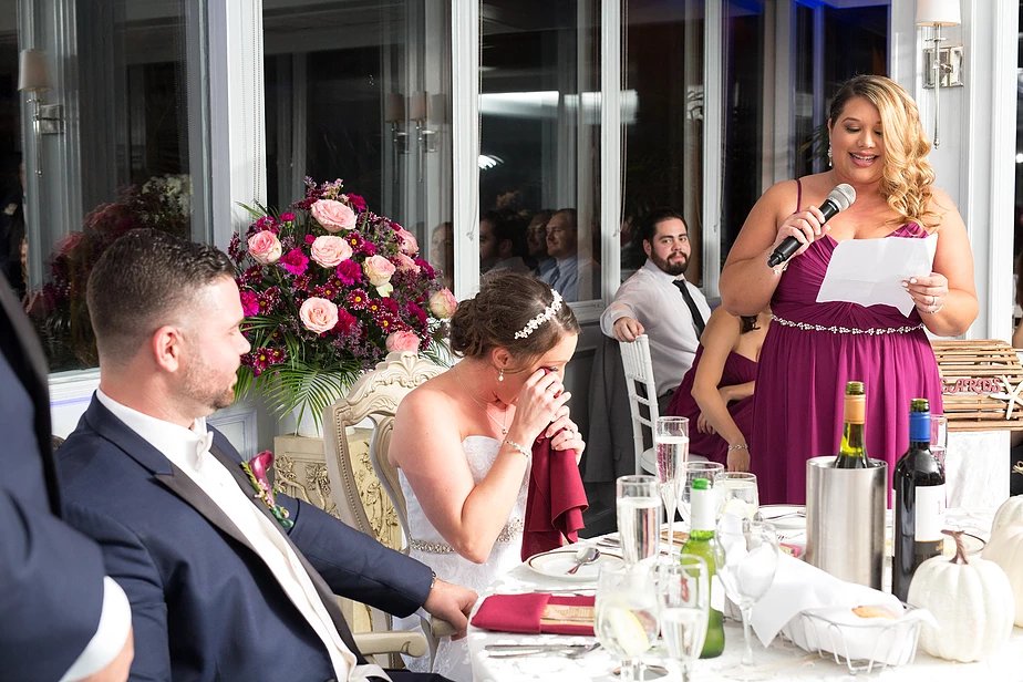 We have to point out that the gorgeous purple bridesmaid dresses and flowers really popped against the white linens, chairs and other decor of the venue, creating a nice contrast. The warm jewel tones and pastels are simply stunning!