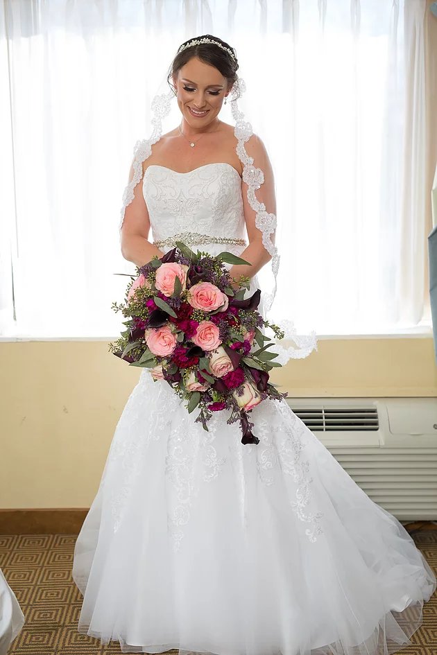 Amanda’s gorgeous bridal bouquet is a medium tear-drop cascading bouquet with blush opened roses, wine colored mums, eggplant calla lillies, dark purple and burgundy mini carnations, wrapped in ivory and gold ribbon.